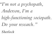 While I’ve long been aware of Sherlock Holmes as a cultural touchstone and icon (Sherlock Hemlock, anyone?), I’ve never read or watched any other adaptations of the Sir Arthur Conan Doyle series, so I’m a bit of a neophyte. I really enjoyed this particular incarnation, though: a modern-day Sherlock whose refrain has been updated from Elementary, my dear Watson to the occasional, disdainful Obviously.